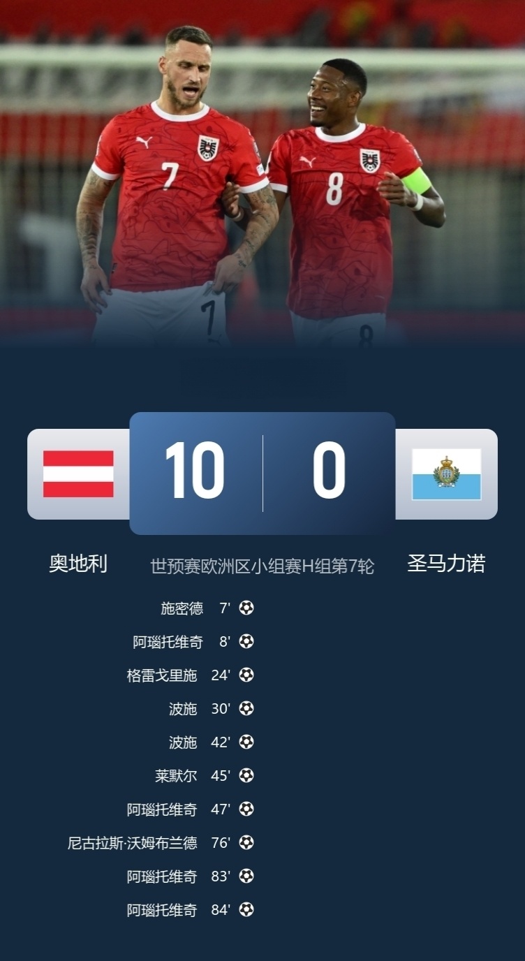 北京时间10月10日凌晨02:45,在世预赛欧洲区小组赛H组第7轮的比赛中,被C罗称之为不是教练的朗尼克执教的奥地利主场10-0横扫圣马力诺,其中前上海海港旧将阿瑙托维奇上演了大四喜的好戏。可以说每一轮世预赛欧洲区的比赛中都能刷出多场大比分的比赛,部分攻击手的参与进球数据那是“洗刷刷”快速提升。