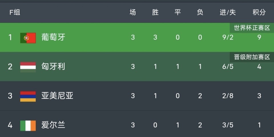葡萄牙3战全胜9分领跑,下轮只要击败4分的小组第二匈牙利,就能提前晋级世界杯,亚美尼亚3分,还能争夺附加赛名额。
