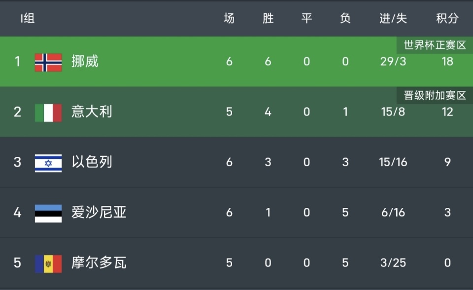 5队小组,挪威6战全胜18分领跑,意大利少赛1场积12分,落后6分,而两队直到最后一轮才交手,所以意大利很可能连续三届踢附加赛。以色列6战9分已经无缘直通,争夺小组第二。爱沙尼亚3分彻底出局,摩尔多瓦0分垫底,但可能通过欧国联拿到附加赛资格。