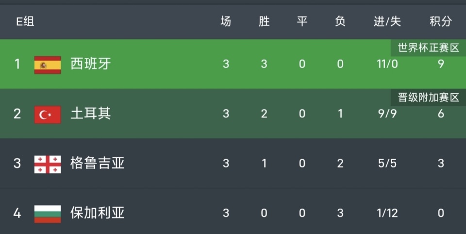 西班牙3战全胜9分领跑,土耳其2胜1负6分,格鲁吉亚3分,保加利亚0分。西班牙下轮对阵保加利亚,4连胜问题不大,最后一轮对阵土耳其,打平就能出线。