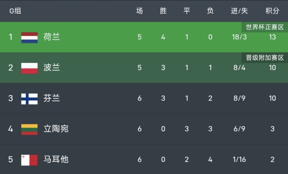 5队小组,荷兰4胜1平13分,但波兰和芬兰都是10分,未来两轮,荷兰接连对阵芬兰、波兰,这两场比赛将决定直通世界杯和附加赛名额的归属。立陶宛3分,马耳他2分,已经确定无缘世界杯。