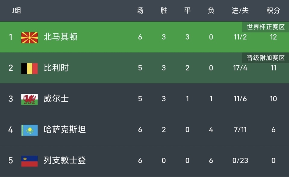 5队小组,北马其顿6轮12分,比利时少赛1场11分,威尔士少赛1场10分,3队都有机会。下轮威尔士和比利时强强对话,胜者将在竞争中占据优势,列支敦士登0分彻底出局。
