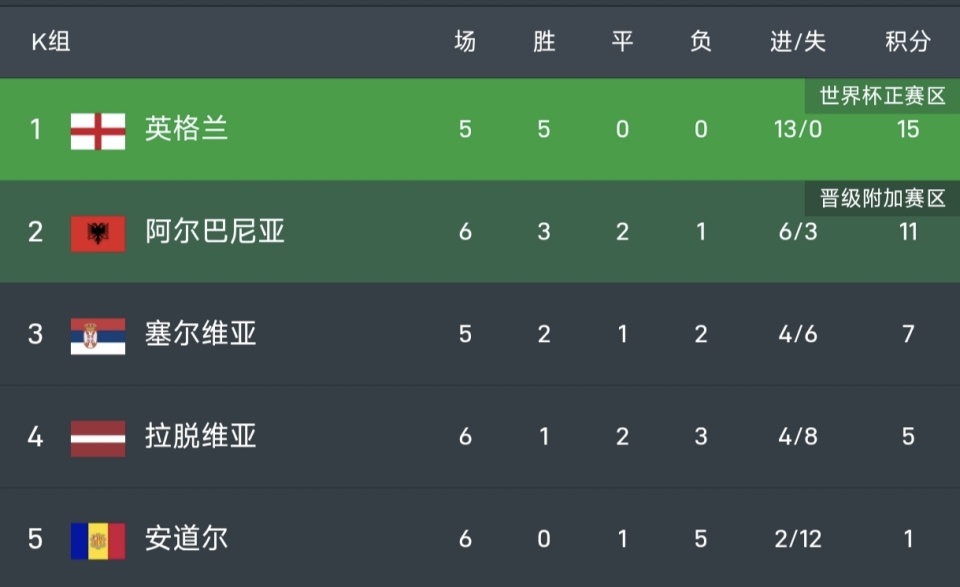 5队小组,英格兰本轮轮空,5战全胜15分,少赛1场领先第二名阿尔巴尼亚4分,出线形势占优。塞尔维亚少赛1场7分,也有机会竞争附加赛名额,安道尔1分彻底出局。