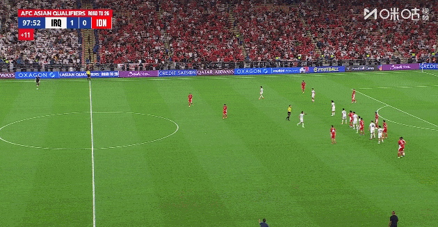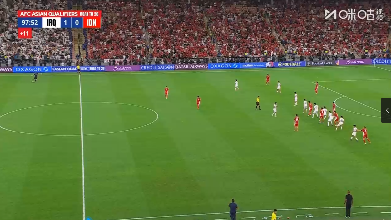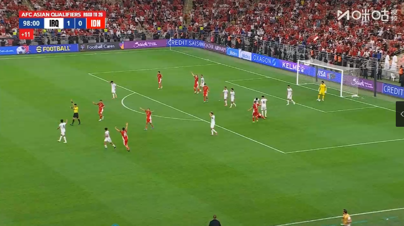 本场最大的争议发生在补时阶段的判罚,印尼在后场有守门员踢出直接任意球,印尼2号队员和伊拉克4号队员在争抢的时候被手臂打了一下,马宁出示黄牌警告4号队员,由于这是其本场的第二张黄牌,因此被出示红牌罚令出场,但是马宁并未判罚点球,并且VAR也未介入,印尼质疑马宁都将对方罚出去了,为啥不判点球。