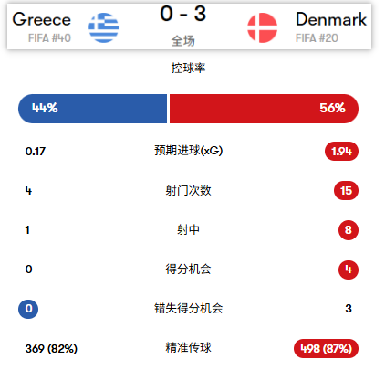 况且上次丹麦直接在客场打爆了希腊,数据很直观: