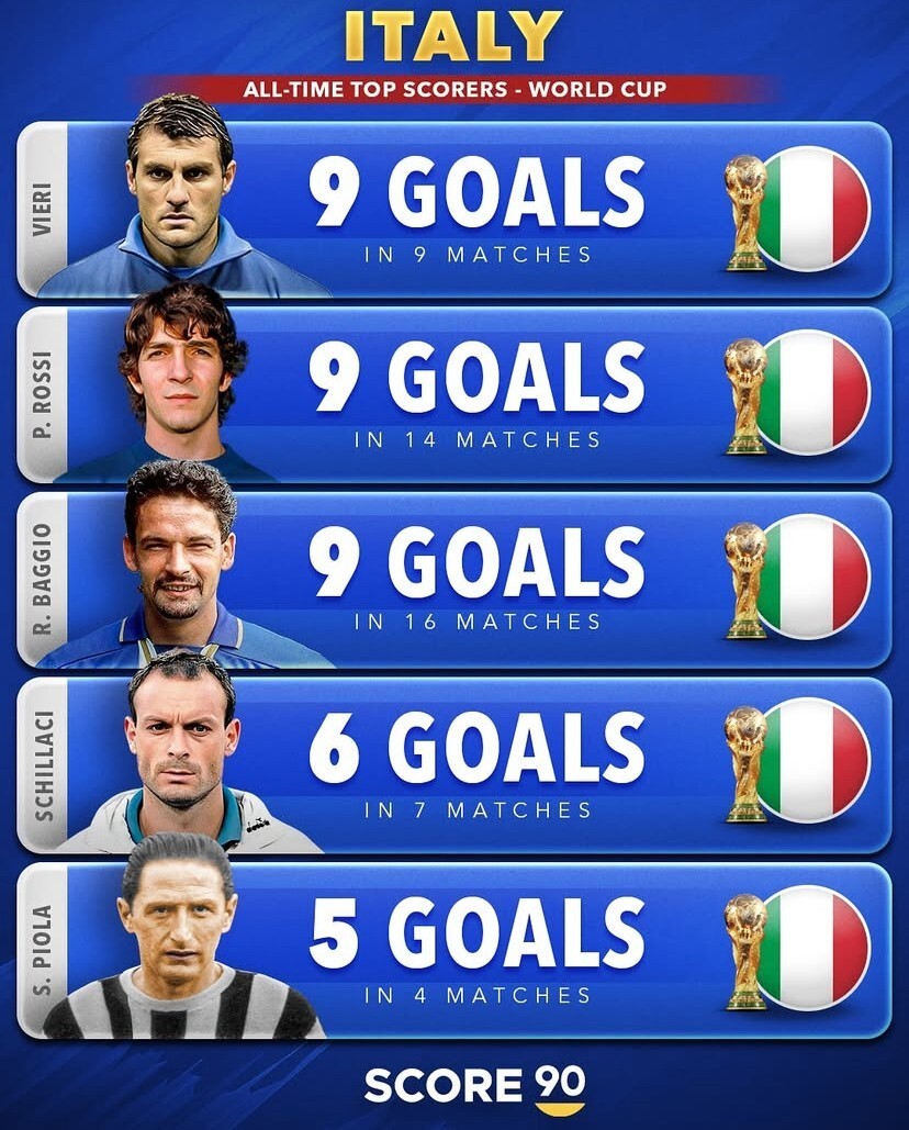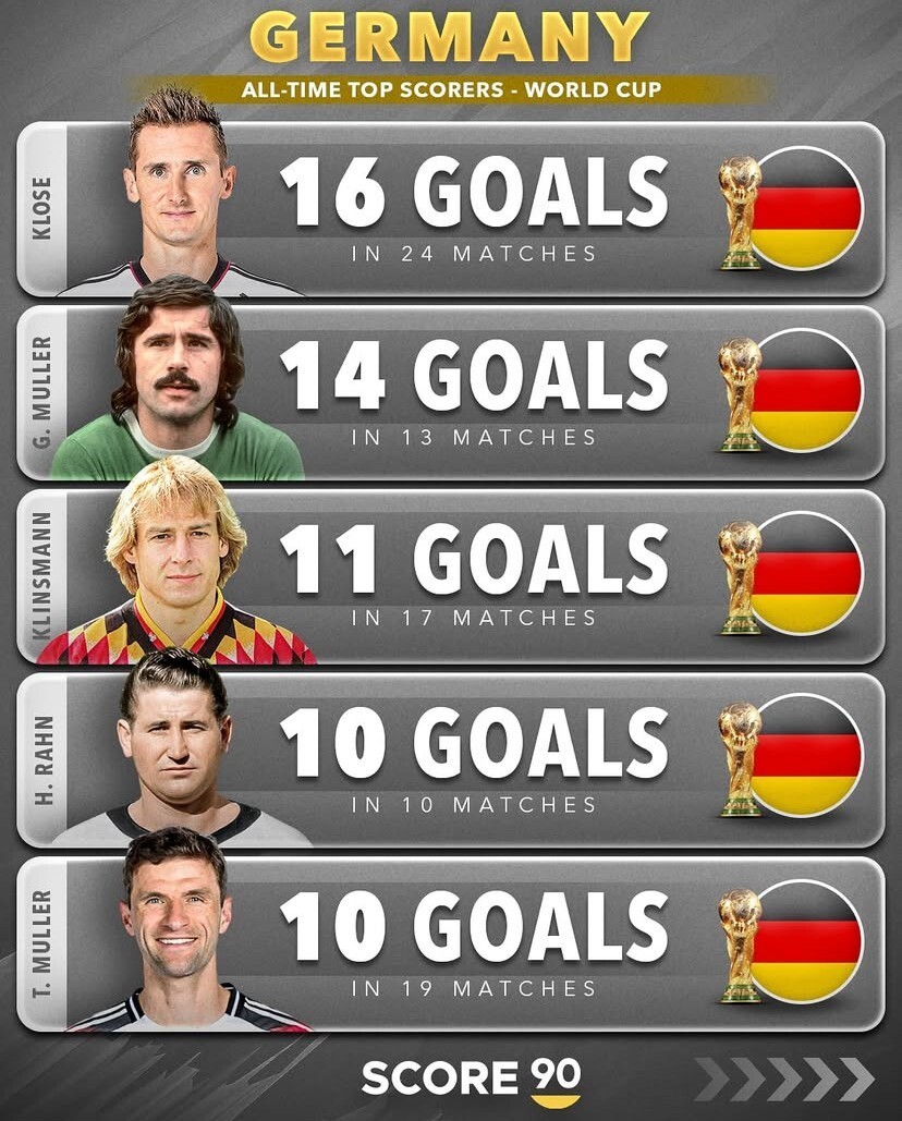 八大国家队世界杯进球榜:克洛泽16球第1,大罗第2,梅西第3