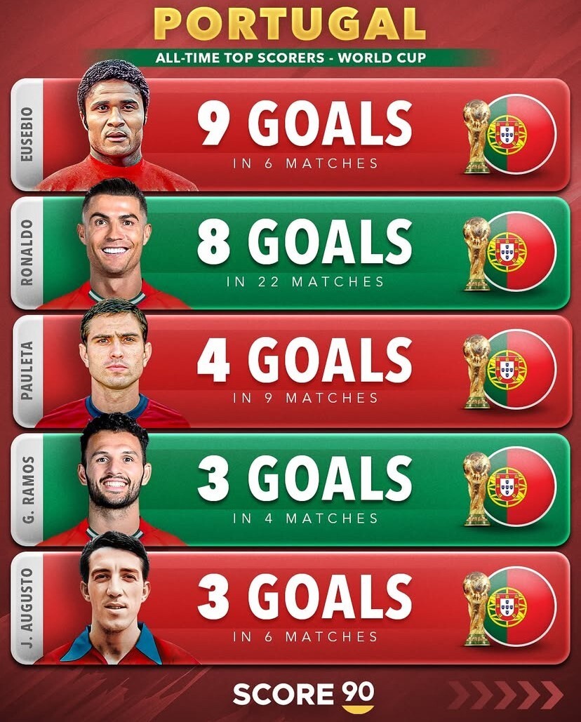 北京时间10月13日,Score 90统计出了法国、阿根廷、葡萄牙、巴西、西班牙、英格兰、德国以及意大利8支国家队的世界杯射手王,其中克洛泽以16球排名所有球员之首,罗纳尔多15球位列第二,梅西与方丹同以13球并列第三位。