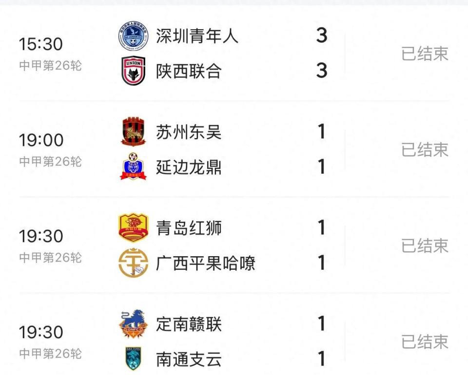 北京时间10月12日,中甲联赛第26轮进行了最后的四场比赛。戏剧性的结果是,4场比赛全都是平局。具体比分如下: