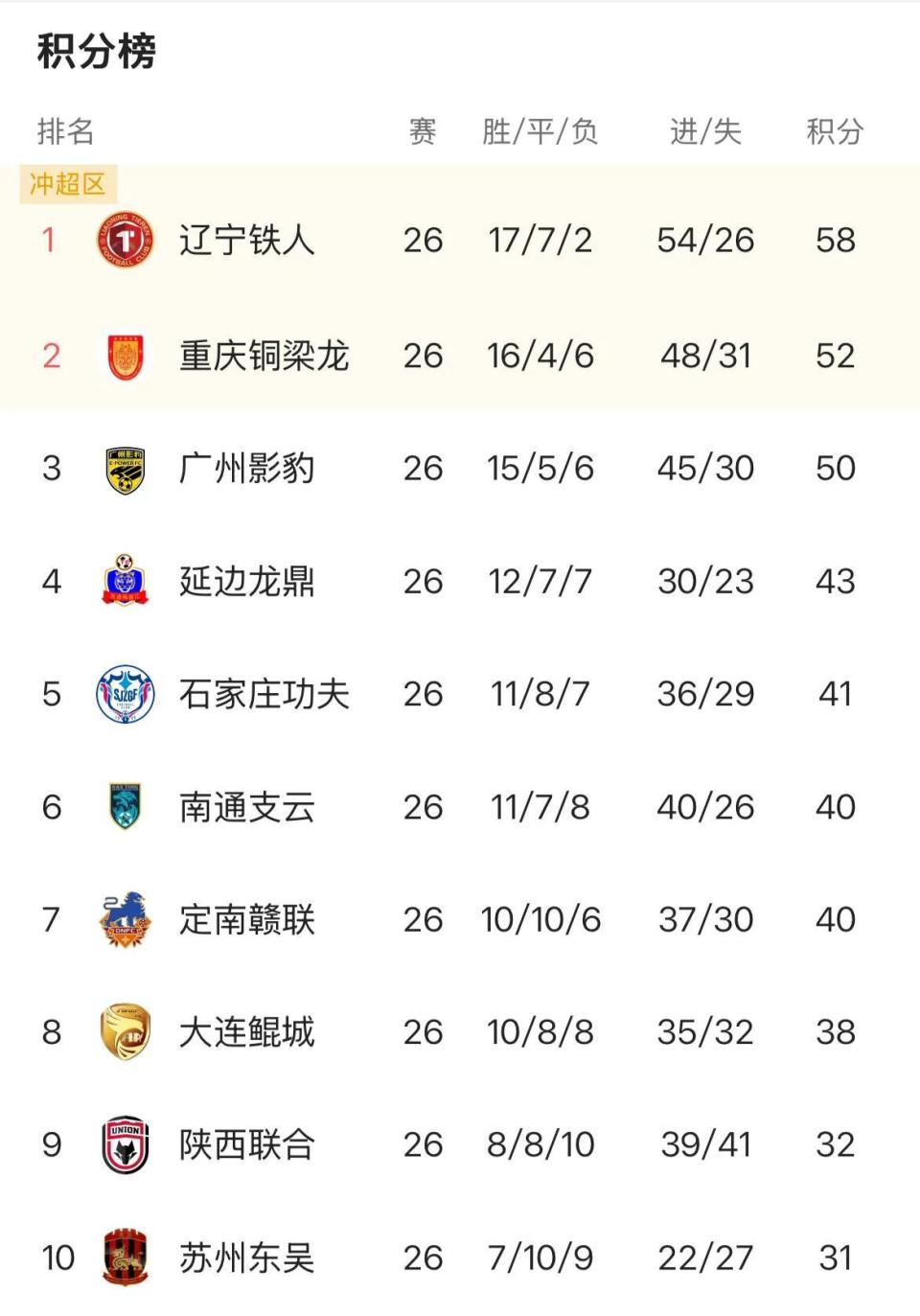 中甲26轮最新积分榜:冲超格局清晰了!保级仍不明朗 辽宁绝对优势