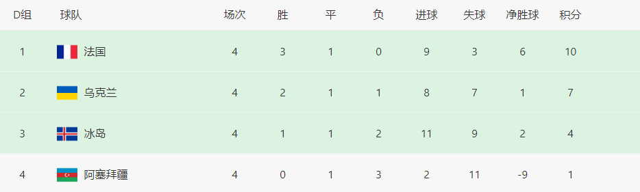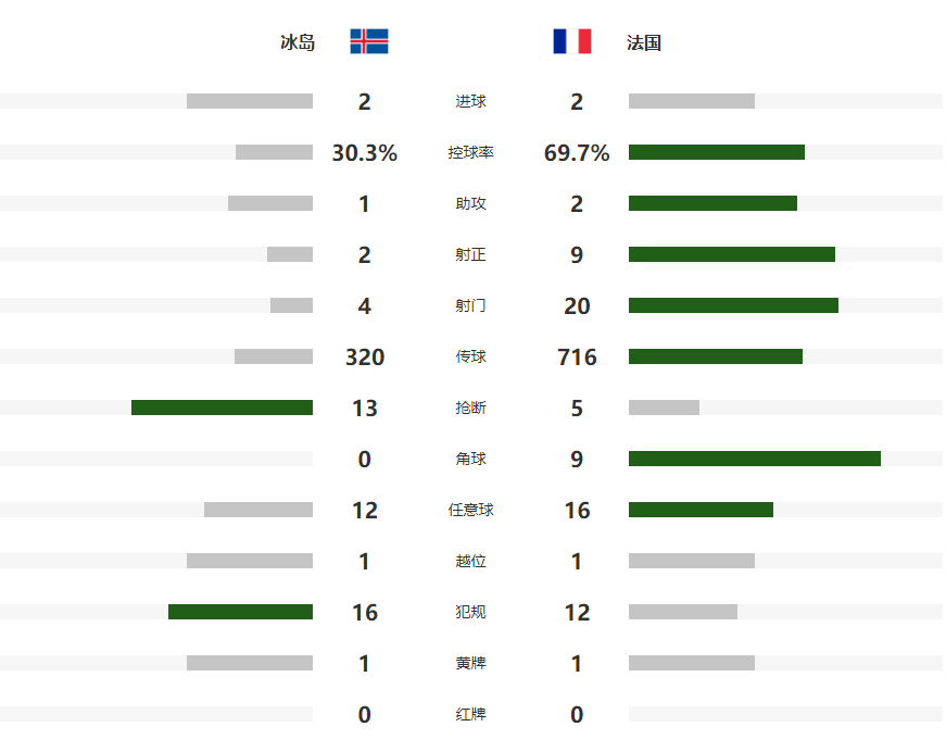 本场比赛帕尔松上半场就帮助冰岛取得领先,虽然恩昆库和马特塔在下半场6分钟之内连入2球,但替补登场的赫林闪电扳平,最终两支球队激战90分钟,2-2握手言和,法国队继续排名D组第一,但是领先的优势已经被乌克兰缩小到了3分。