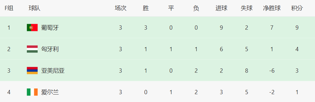 F组的葡萄牙,3战9分排名榜首,匈牙利3战4分,亚美尼亚3战3分。葡萄牙主场迎战匈牙利,亚美尼亚客战爱尔兰。如果葡萄牙战胜匈牙利,并且亚美尼亚丢分,那么4场12分的葡萄牙,至少领先第2名7分,在仅剩2轮的情况下确定出线。