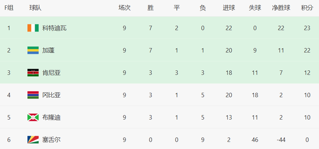F组的科特迪瓦9场23分,加蓬9场22分,最后1轮迎来生死之战。科特迪瓦将命运掌握在自己手上,战胜肯尼亚就能成功晋级世界杯。