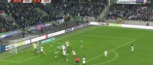 第61分钟,德国后场传球失误送礼,加尔布雷斯断球抽射稍稍打偏。第70分钟,格雷茨卡中路突破再送斜传,格纳布里小角度强行起脚射门,又被北爱尔兰门将神勇扑出。