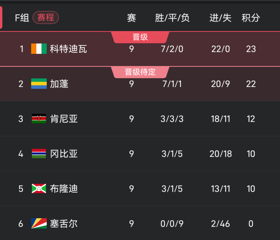 F组,科特迪瓦以23分排名第一,加蓬22分排名第二。末轮科特迪瓦主场面对小组第三肯尼亚,加蓬主场面对小组第五布隆迪。由于只有1分优势,科特迪瓦只有赢球才能稳稳出线。如果科特迪瓦平局或者输球,加蓬就有机会凭借一场胜利反超科特迪瓦直通世界杯。