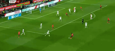 上半场结束前,45+3分钟,门德斯在左路送出妙传,C罗反越位,甩开防守球员,在门前抢点推射破门,梅开二度!这是C罗在世预赛打进的41球,已经领先第二名2球了。