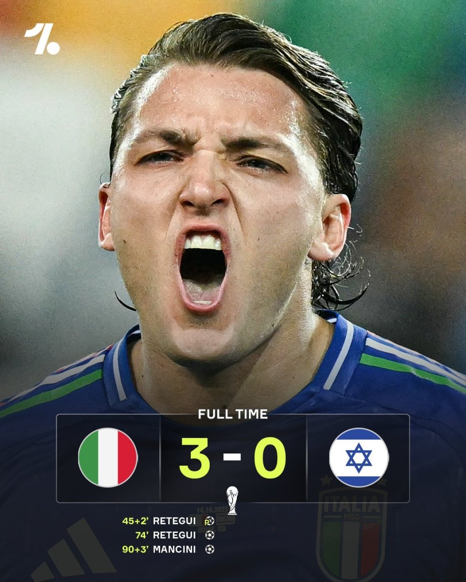 世预赛欧洲区小组赛I组第8轮,意大利主场3-0击败以色列,豪取5连胜距榜首3分。雷特吉造点+点射首开纪录,弧顶远射梅开二度,小曼奇尼替补建功。