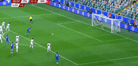上半场补时第2分钟,雷特吉造点,随后亲自主罚抽射上角命中,意大利1-0领先以色列。