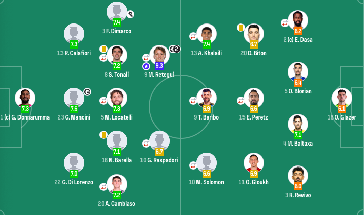 意大利首发:1-多纳鲁马、22-迪洛伦佐、23-曼奇尼、13-卡拉菲奥里、20-坎比亚索(85'4-斯皮纳佐拉)、18-巴雷拉、5-洛卡特利(86'16-克里斯坦特)、8-托纳利(93'11-皮科利)、3-迪马尔科、10-拉斯帕多里(46'15-埃斯波西托)、9-雷特吉(92'19-坎比亚吉)