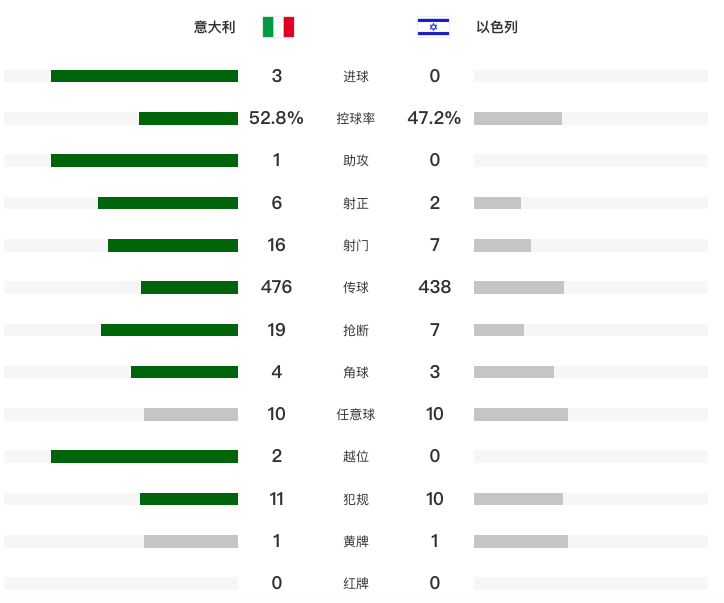 在北京时间10月15日结束的世界杯欧洲区预选赛I组一场焦点战中,意大利男足在主场3-0完胜以色列。上半场,雷特吉点射破僵。下半场,坎比亚索进球被吹,雷特吉完成梅开二度,曼奇尼补时头槌锁定胜局。