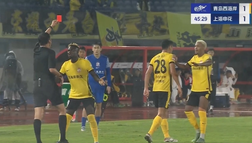 这还没完,半场结束前,36岁的张呈栋因为不满边裁举旗太晚的判罚,持续追着向边裁进行激烈的言语攻击,自家外援拉都拉不住,最终他也被连出两黄罚下,西海岸半场不到便少打2人。
