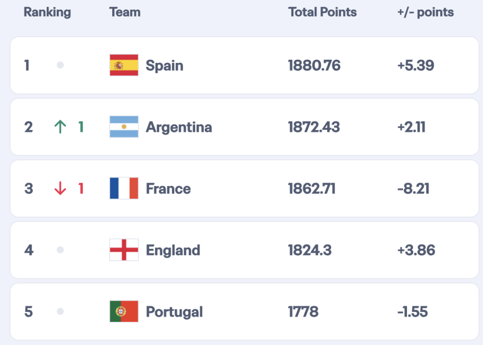 雷速体育10月17日讯 FIFA官方日前更新了最新一期世界排名,西班牙领跑,阿根廷、法国、英格兰、葡萄牙前五,国足上升一位至93位。