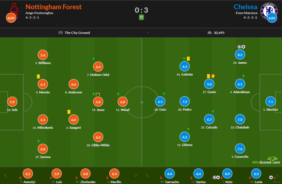 诺丁汉森林首发:26-塞尔斯、4-莫拉托、5-穆里略、35-津琴科、31-米伦科维奇、6-桑加雷、12-道格拉斯-路易斯、8-E-安德森、10-吉布斯-怀特、9-阿沃尼伊、3-内科-威廉姆斯