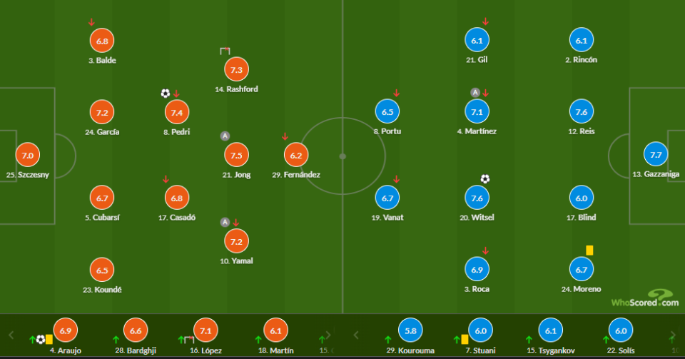 巴塞罗那(4-2-3-1):什琴斯尼;孔德,库巴西,埃里克-加西亚,巴尔德(76'赫拉德-马丁);卡萨多(81'阿劳霍),佩德里(63'克里斯滕森);亚马尔(63'巴德吉),德容,拉什福德;托尼-费尔南德斯(46'费尔明)