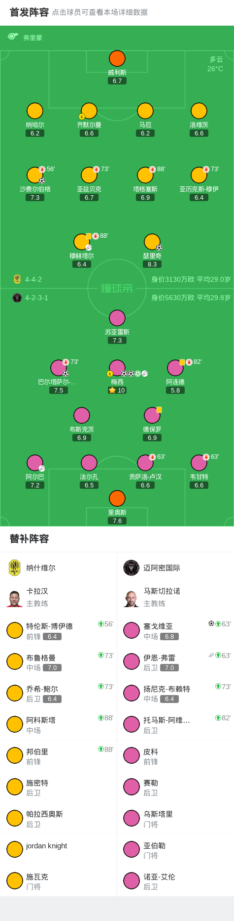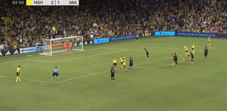第63分钟,纳哈尔手球送点,梅西主罚点球一蹴而就,迈阿密2-2