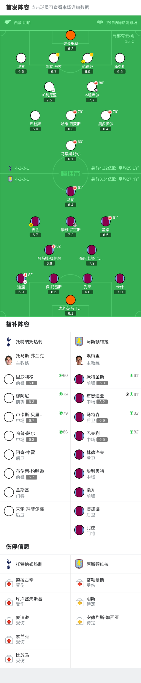 北京时间10月19日,英超联赛第8轮展开较量,托特纳姆热刺坐镇主场迎战阿斯顿维拉。上半场,帕利尼亚助攻本坦库尔闪击破门,摩根-罗杰斯精彩远射扳平比分;下半场,布恩迪亚同样远射破门,帮助维拉实现反超。最终,热刺主场惨遭逆转,1-2不敌维拉。
