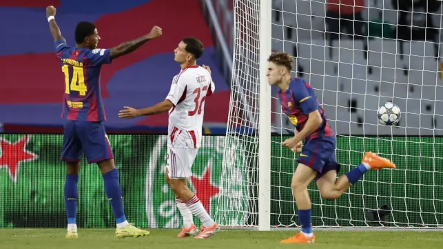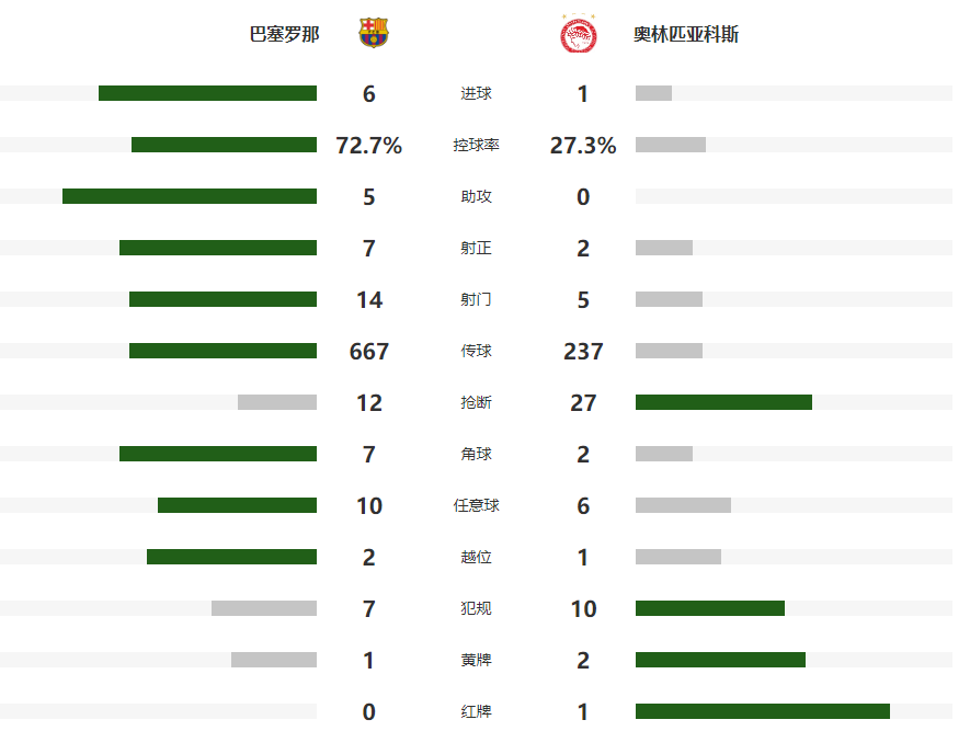 北京时间10月22日凌晨,欧冠联赛阶段第3轮中,巴萨主场6-1击败奥林匹亚科斯,各项赛事两连胜。费尔明上演帽子戏法,拉什福德梅开二度,亚马尔点球破门,卡埃比为客队扳回一城,埃泽被红牌罚下。