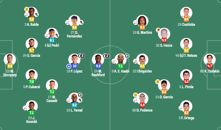 巴塞罗那(4-2-3-1):什琴斯尼;孔德(75'阿劳霍),库巴西,埃里克-加西亚,巴尔德(75'赫拉德-马丁);卡萨多,佩德里(80'贝尔纳尔);亚马尔(75'巴德吉),费尔明,德罗-费尔南德斯(59'德容);拉什福德