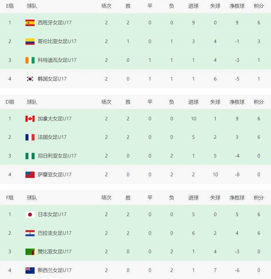 这个小组,西班牙女足和哥伦比亚女足分列一二位。