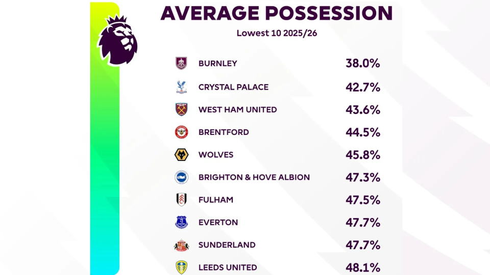 然而,英超的大多数球队不会给出这种空间。布伦特福德尤其不会——他们总是以深度防线和窄阵型遏制强敌。本赛季对阵曼城、切尔西和阿斯顿维拉时,他们的平均控球率仅为29.7%,却拿到了4分。