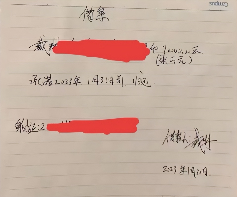 李平康晒出的证据包括一张戴琳手写的借条,写于2023年1月20日,并承诺“1月31日之前归还”,距今已经超过两年时间,但是债主透露戴琳一直没有还钱。此外,李平康还展示了一张他与戴琳债主的对话截图,债主自称目前病情严重,曾央求戴琳“多少还点钱”,但戴琳连300块钱也不愿拿出,最后债主只要出200块钱。