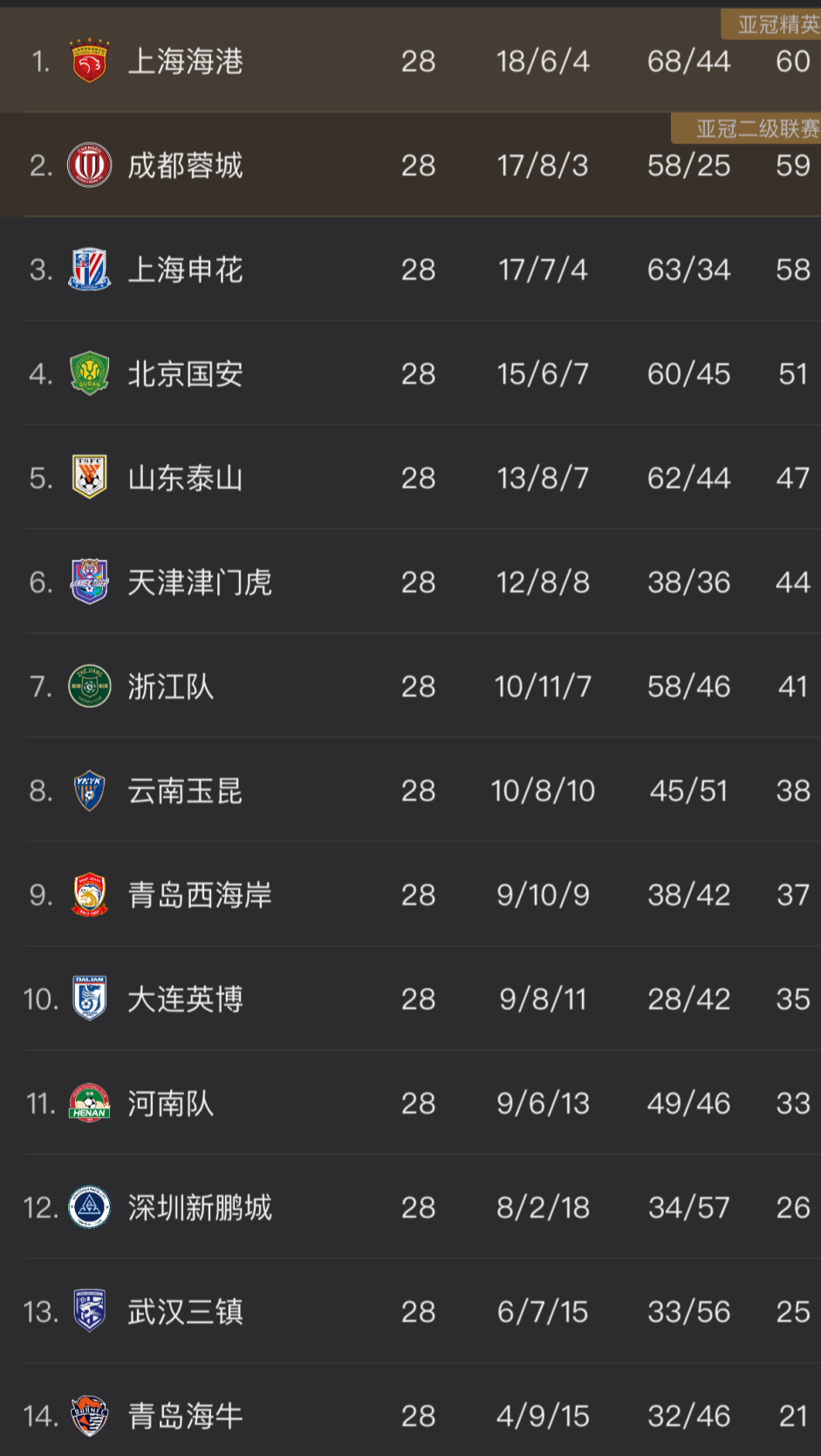 本轮过后,60分的海港依然领跑,不过领先优势缩小至1分。蓉城积59分排名第2位,申花58分排名第3。依然保持争冠希望的2队,将在最后2轮展开决战。