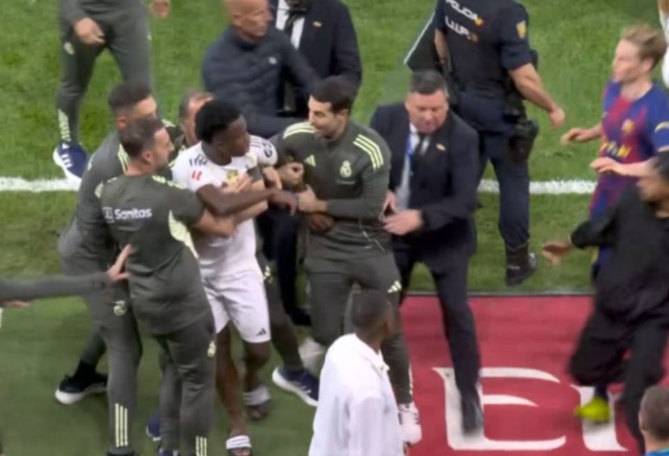 亚马尔虽然嘴上一直没停,但他身体“很诚实”:不断向球员通道撤退,试图早点离开。在这次冲突中,维尼修斯最为激动,他试图冲到亚马尔身边与之干架,但被工作人员拦下。