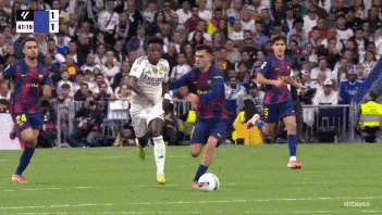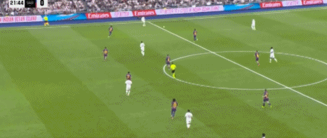 开局阶段,由于皇马也在打着高位压迫,维尼修斯拿球后的冲刺空间总是很小,所以还和孔德有种五五开的感觉。等到阿隆索发现中场绞杀+长距离直塞这招行得通,把控球率主动从五五开迅速放到30%之后,维尼修斯开始频繁单兵爆破。