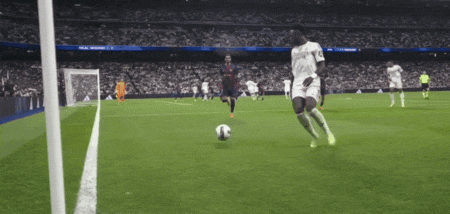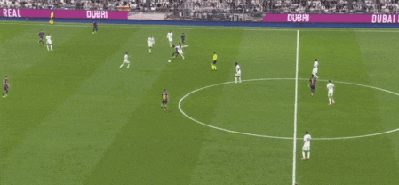开场皇马就打出威胁,巴尔韦德在右路的传球找到活跃在巴萨边后卫和中卫之间的维尼修斯。不过,维尼修斯传球被巴萨巴尔德解围。