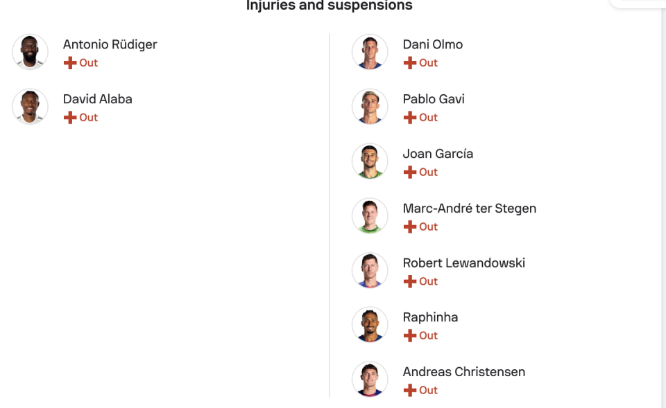双方经历过周中的欧冠,和皇马阵容齐整相比,巴萨这边饱受伤病困扰,本来期望拉菲尼亚能够复出,而巴西边锋没有及时复出,所以巴萨只能排出来替补攻击线。看起来阵容不错,至少有个完整攻击线,实际上只要亚马尔哑火,巴萨前场就没什么戏了,毕竟费兰托雷斯水平不足以担纲中锋。