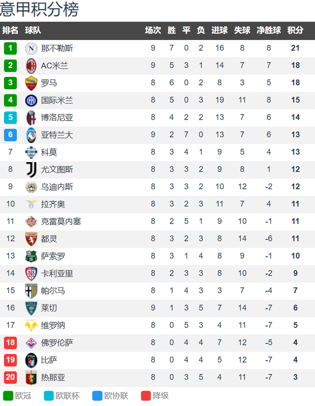 那不勒斯9轮7胜2负积21分领跑,AC米兰5胜3平1负积18分排名第二,罗马少赛一场积18分,本轮意甲主场迎战帕尔马,国际米兰少赛一场积15分。罗马本赛季非常强势,红狼军团会是意甲争冠的争夺者;而国际米兰在帅位方面,齐沃还是需要交点学费的;孔蒂知道自己追求什么,欧冠唯唯诺诺,联赛重拳出击,那不勒斯会全力卫冕意甲冠军。