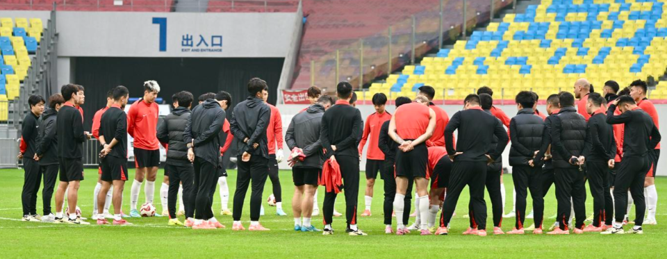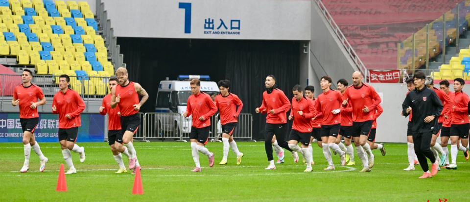 ▲成都蓉城队员们在赛前进行踩场训练