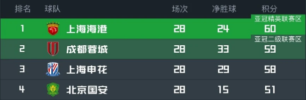 目前的中超积分榜上,上海海港以60分领跑,成都蓉城的积分是59分,而上海申花是58分。如果本轮联赛上海海港取胜,且成都蓉城输球+上海申花不胜,上海海港就能卫冕中超冠军,实现联赛三连冠。