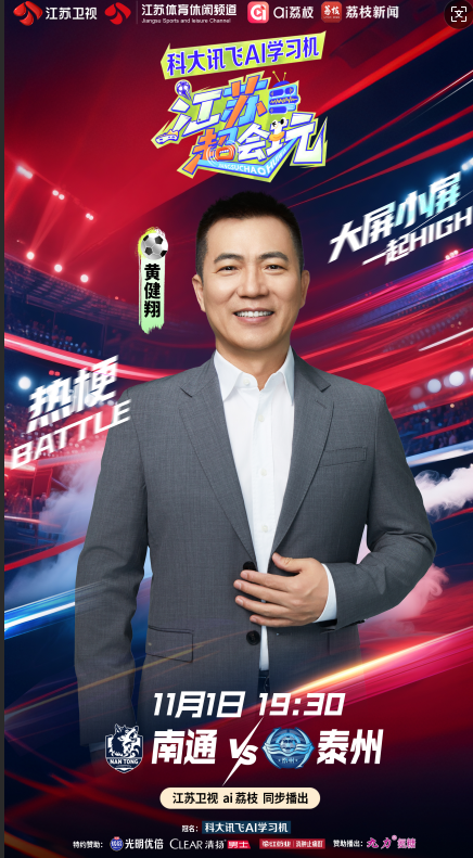 《江苏超会玩》将于今晚19:30,对“苏超”总决赛进行现场直播。届时,江苏卫视主持人李响将搭档主持人孟非、著名解说员黄健翔坐镇直播间,与大家共同见证冠军的荣耀加冕。