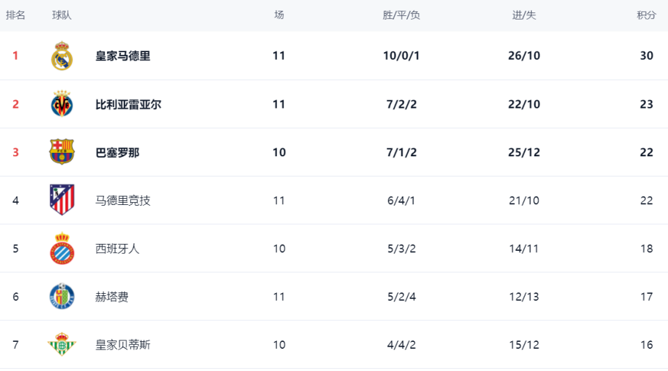 在积分榜上,皇马10胜1负的战绩太出色了,以30分高居榜首。比利亚雷亚尔7胜2平2负,拿到23分,排名第2。少赛一轮的巴萨只有22个积分,排名第3。马竞也是22分,净胜球落后,只能排名第4。西班牙人18分排名第5。第6的是赫塔费,拿到17分。