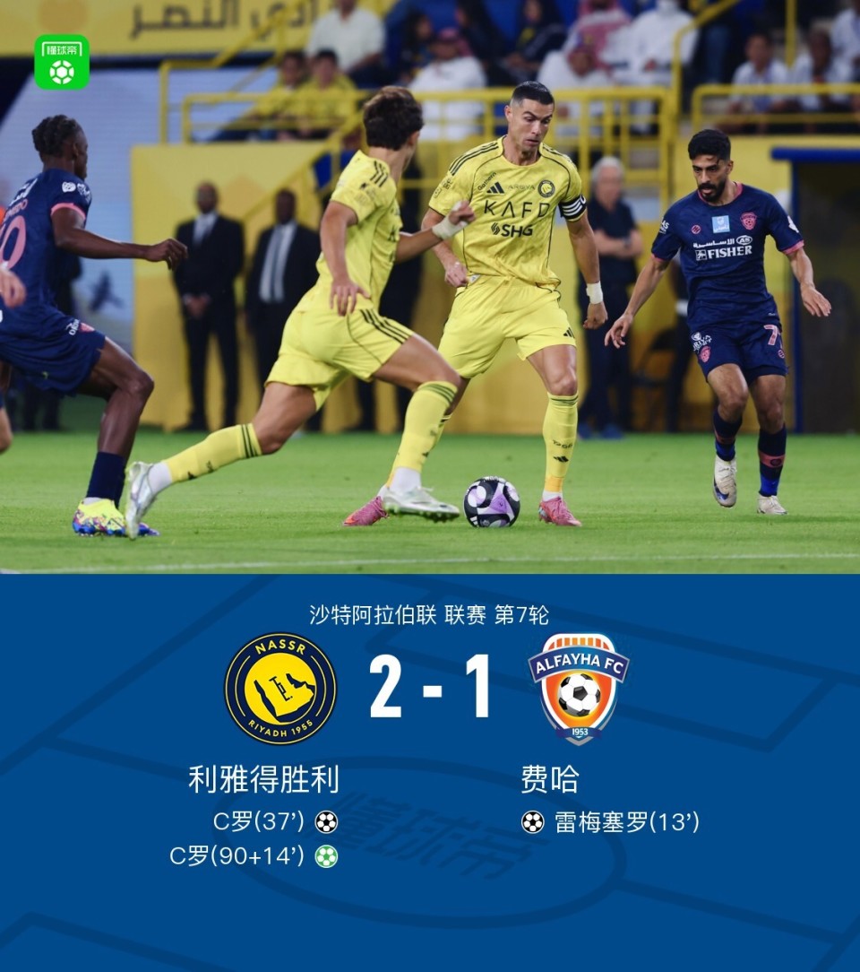 第90+14分钟,C罗点射绝杀梅开二度,利雅得胜利2-1!