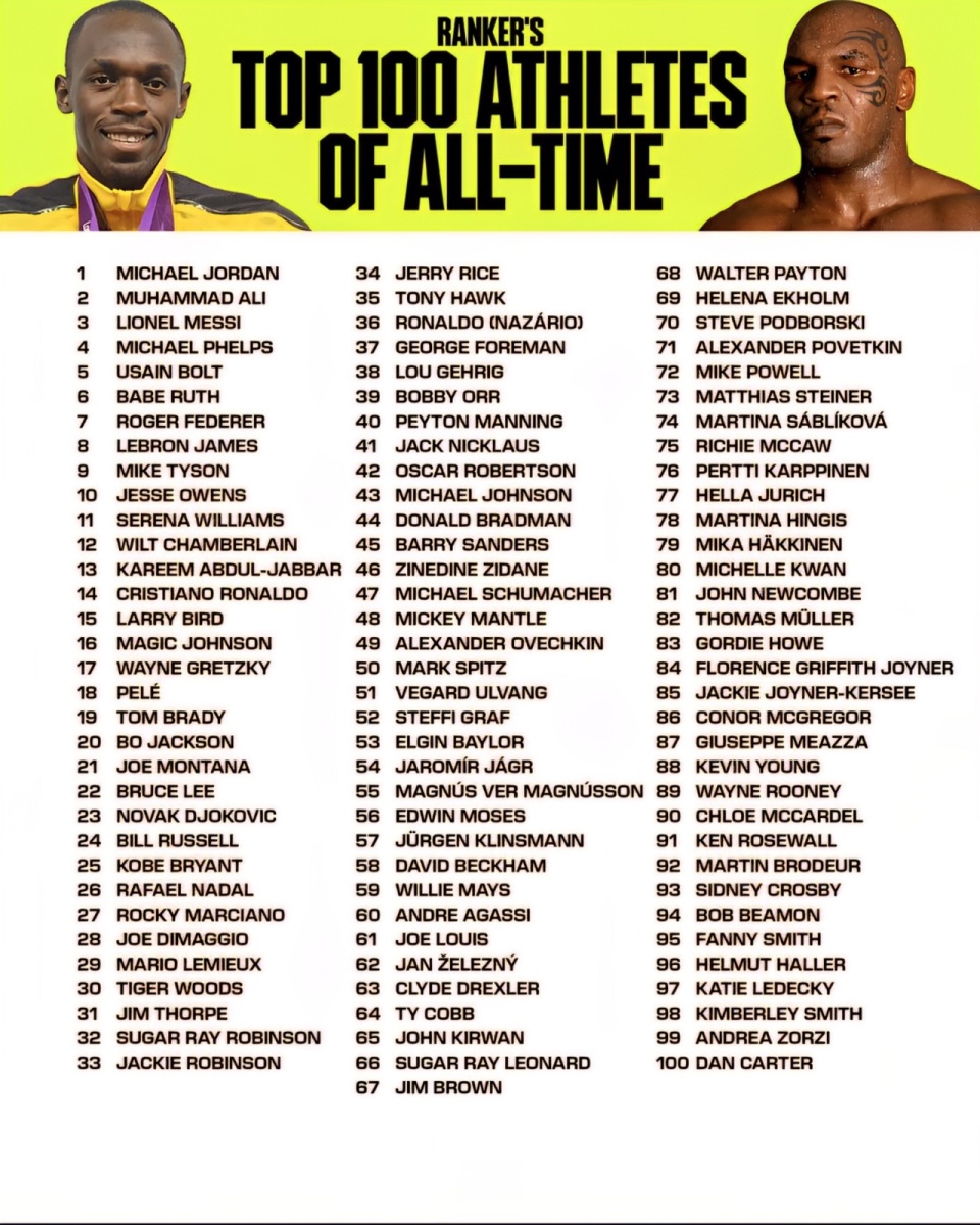 外媒Global Statistics评选历史百大运动员: