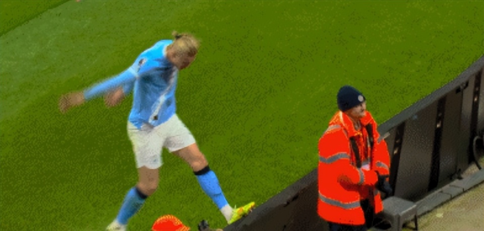 跟第一个进球略显滑稽、哈兰德谢尔基个人作用“倒置”类似的,这个破门也有个滑稽时刻:哈兰德跳上了广告牌想要庆祝,没想到去没踩稳,实在太逗了。
