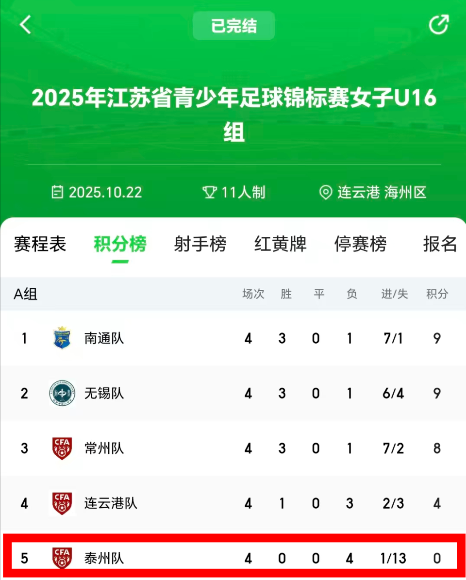 当然江苏省青少年足球锦标赛,不光有男子组比赛,还有女子组;泰州的女足小将们,交出的成绩单同样不怎么样。泰州U16女足,小组赛4场全败,进1球丢13球垫底。