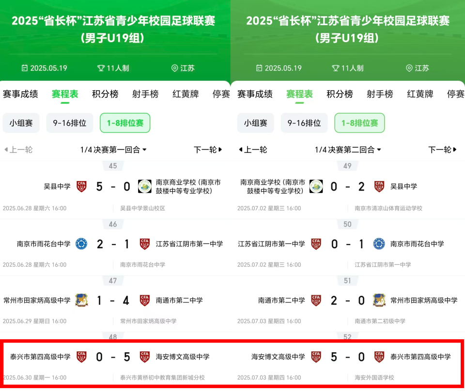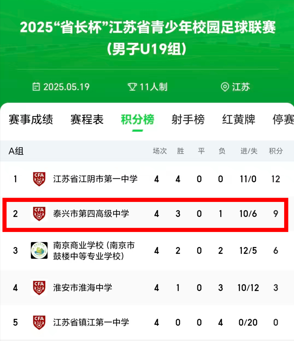 而省长杯U19组别,泰州四高出战分在A组,以3胜1平拿到小组第二出线。排位赛首轮,以两个0比5惨败海安博文高级中学。排位赛第二轮,分别以0比4,0比9惨败常州的田家炳高中。