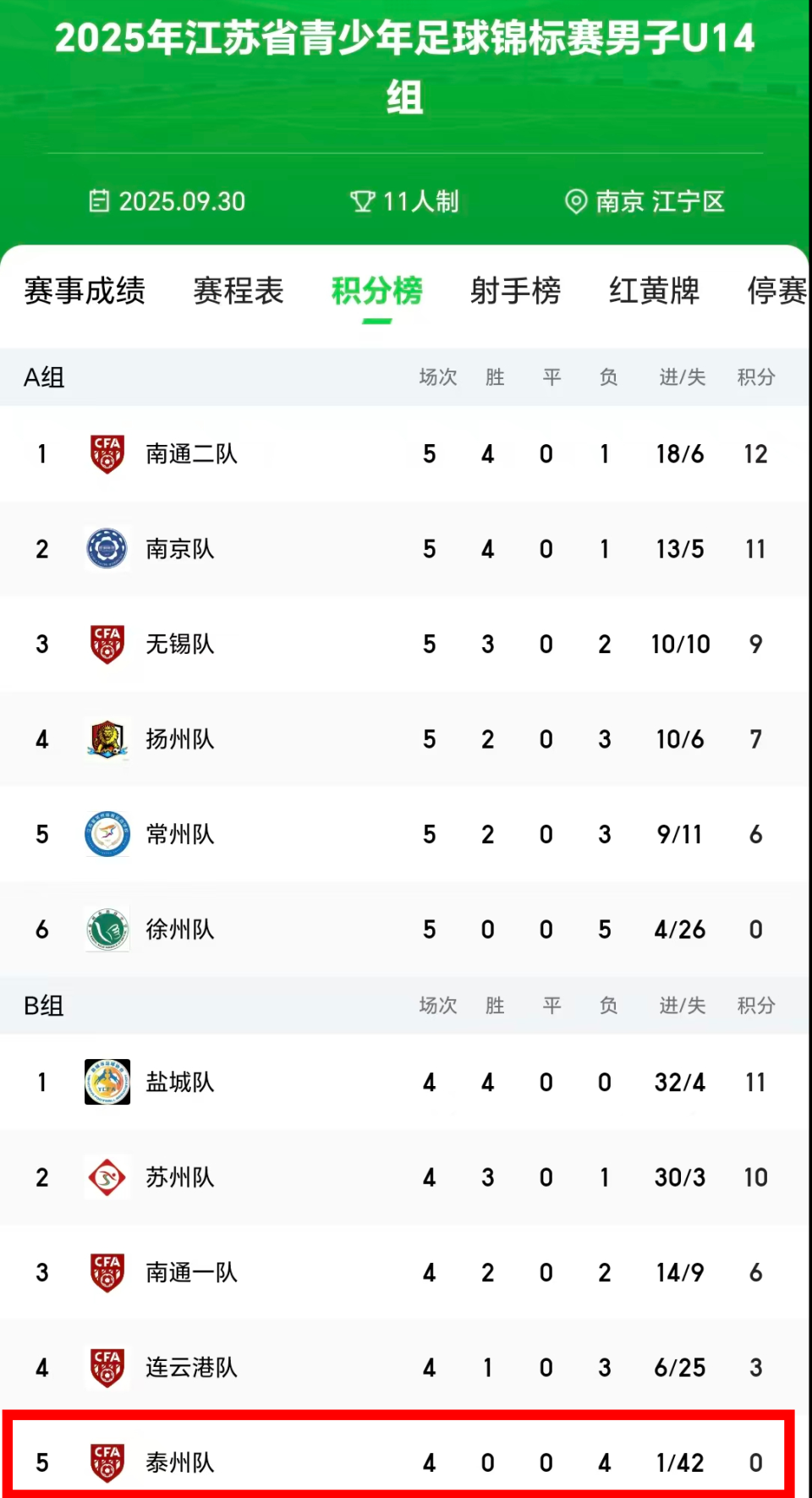 在U14组别,泰州队跟盐城队、苏州队、南通一队、连云港队分在一组;小组循环赛打完泰州队4场全输,仅1球,狂丢42球。